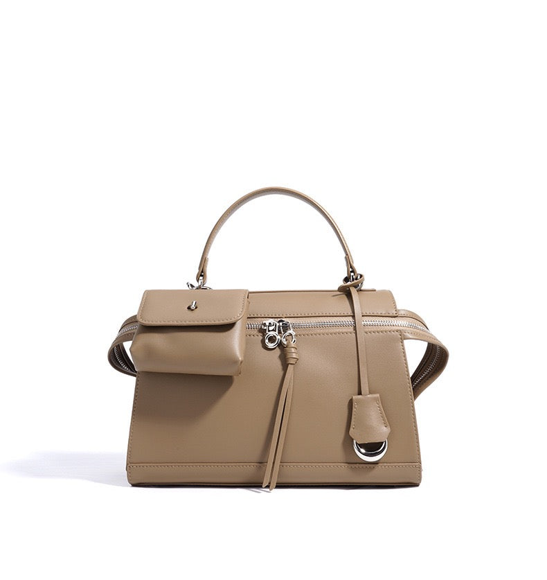 LOMÈNNA Belt Pocket Almond Taupe redefines timeless structure with subtle modern tension. Its boxy form is softened by gentle curves, while a detachable mini flap pouch and signature leather tassel bring both function and flair.